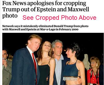 The first photo shows Fox News 'reporting the news' regarding the sexcapades of Jeffrey Epstein and Ghislane Maxwell. In the first photo, Fox News conveniently cropped out Donald Trump. In the second photo [at right] we have the 'full picture' aka the truth.