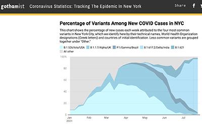 I found a chart that I found of great interest in an August 5, 2021 story in the Gothamist, which was acquired by NPR in 2018. The chart shows how the original CoVid is almost non-existent in the U.S. today, while the Delta variant has risen to represent over 90% of all new cases.
